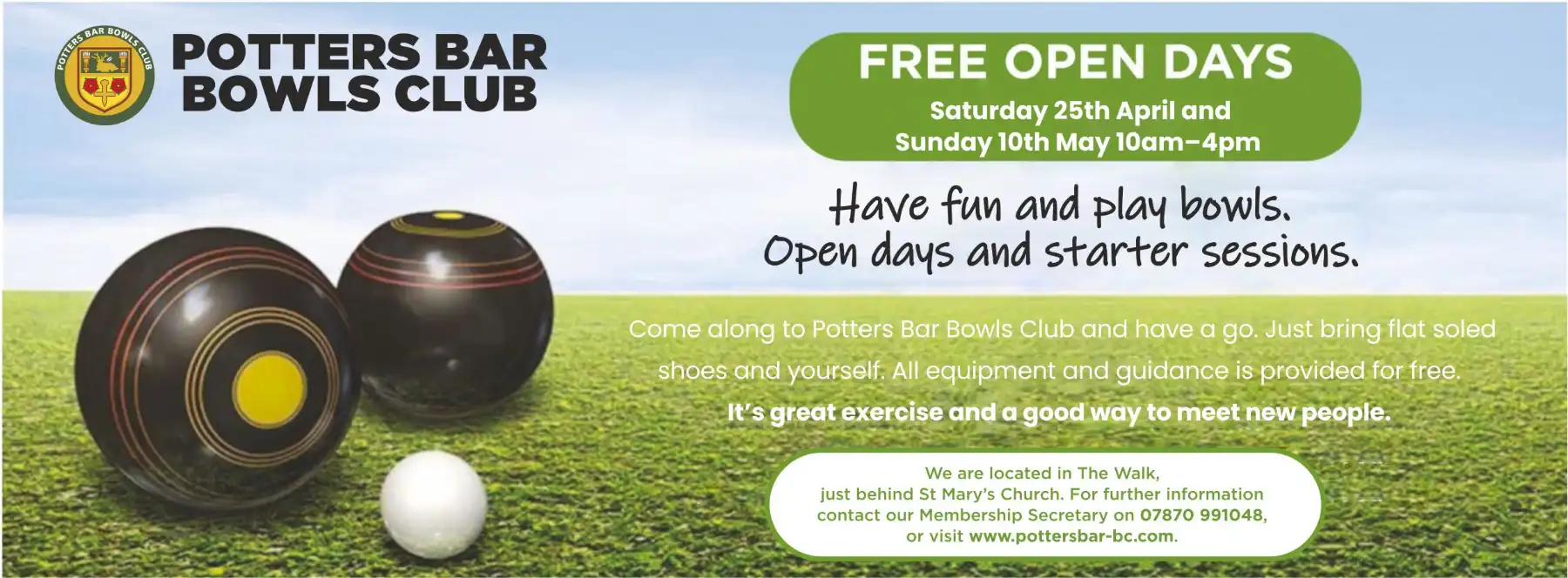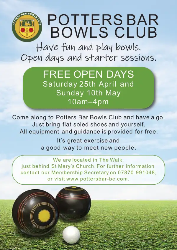 We welcome all new and experienced bowlers. We have a place for you in our friendly club so why not give bowls a go and come along. Early in the season we have Open Days and have set aside times for coaching bowlers. However, we always welcome new members and you are welcome to come and visit us at any time and we will be sure to agree a date/time for you to try playing the game for yourself. We offer free coaching and use of our equipment, all you need to bring are some flat soled shoes to wear on the green. Once you are a member there are plenty of opportunities to play and practice. So do contact our Membership Secretary on 07870 991048 or visit www.pottersbar-bc.com.