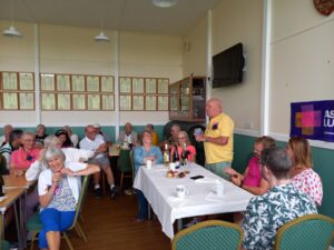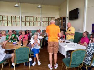 Mick Brennan hosted the annual Presidents Day event on 16 August. We had around 50 members attend for a fun afternoon with some very unusual games held on the green. These included bowling potato into hoola hoops, bowling to buckets of fruit and batted balls to see how many went into the bucket, followed by a delightful cream tea. £419 was raised on the day for Asthma + Lung UK Charity